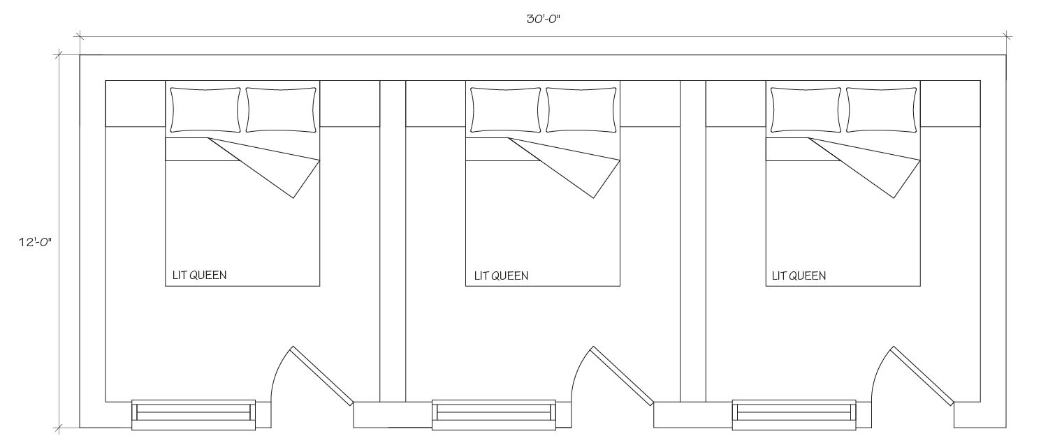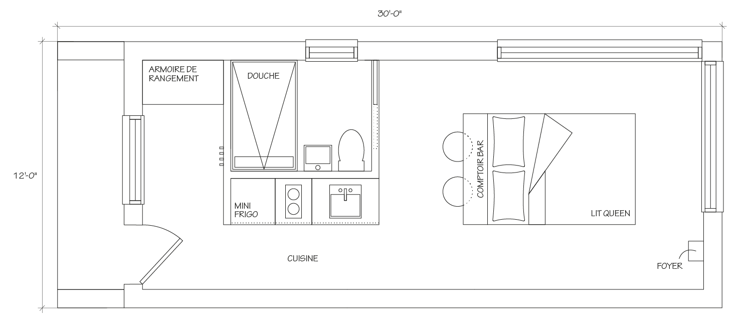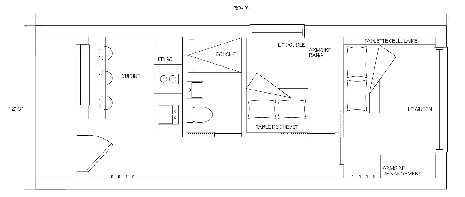 10 x 30 pi incluant une terrasse extérieure de 3 pi. *Aussi disponible en 12 pi de large.